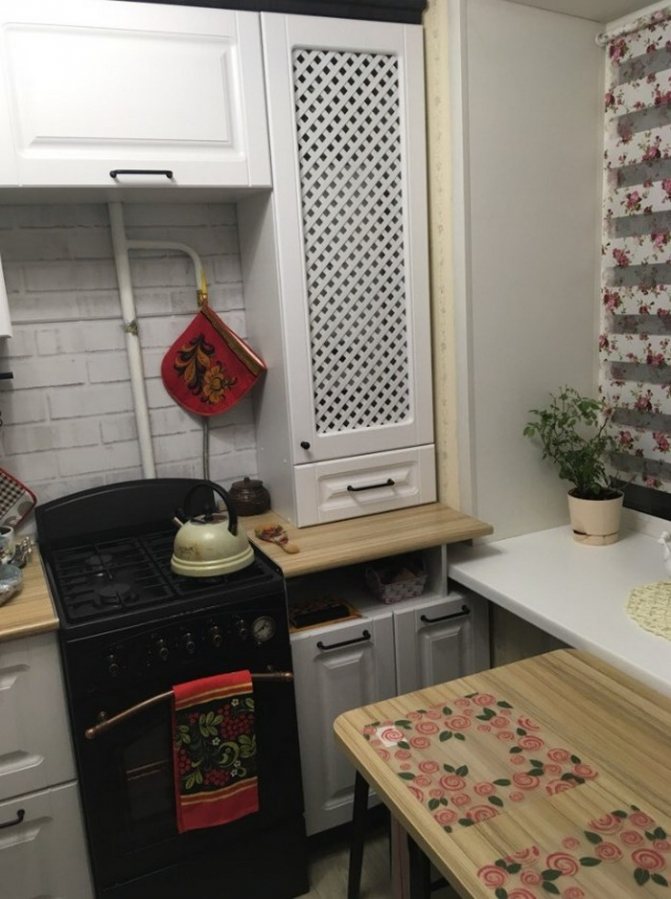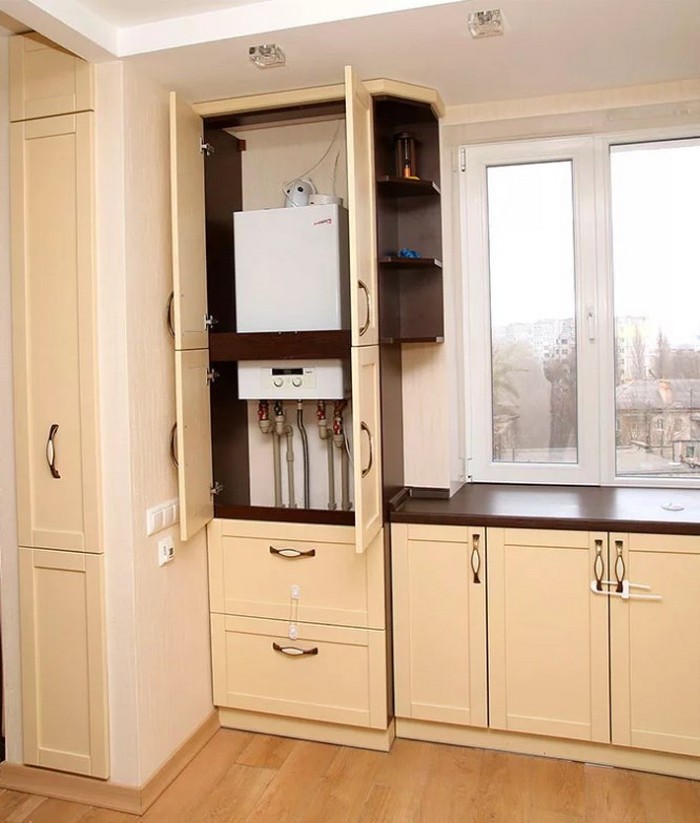 Pour que la boîte cachant l'équipement à gaz ne se démarque pas des autres, les armoires murales de l'ensemble de cuisine doivent être commandées en fonction de la taille de l'unité. Par conséquent, il est nécessaire de prévoir une conception classique après son installation.