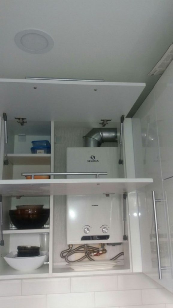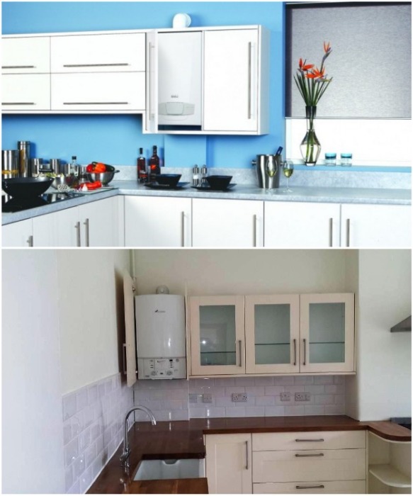 • Assez souvent, l'équipement est masqué par un corps mezzanine avec un fond ouvert et un dessus situé au-dessus de l'évier. Mais en même temps, il n'est pas recommandé de fixer étroitement la chaudière aux parois de l'étagère. En général, ce n'est pas la meilleure solution, mais si elle respecte les règles de sécurité, alors cette option est également autorisée.