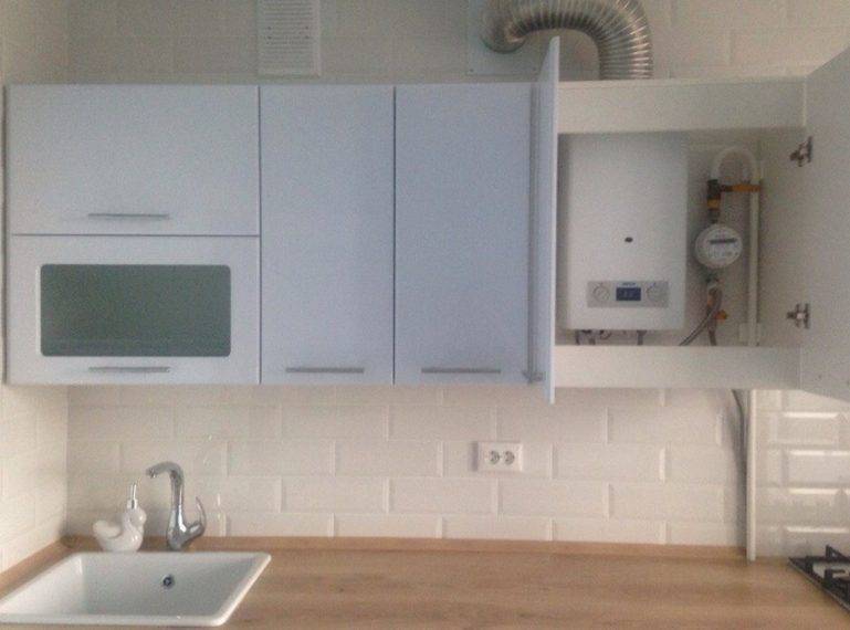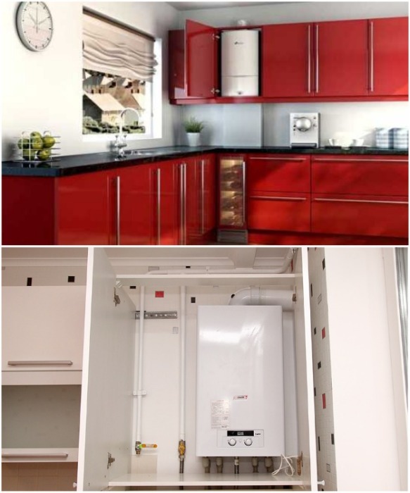 Mais dans ce cas, comme dans le cas d'un placement ouvert, il est important de ne choisir que des matériaux à faible indice d'inflammabilité. De plus, lors de la fermeture de la chaudière à gaz à l'intérieur des armoires de cuisine, il est important d'assurer une ventilation.