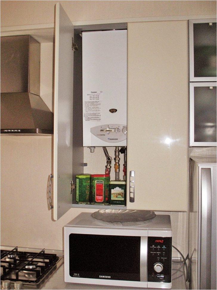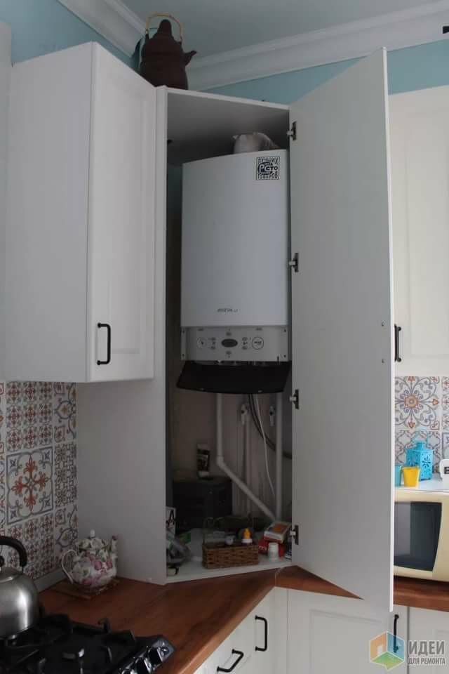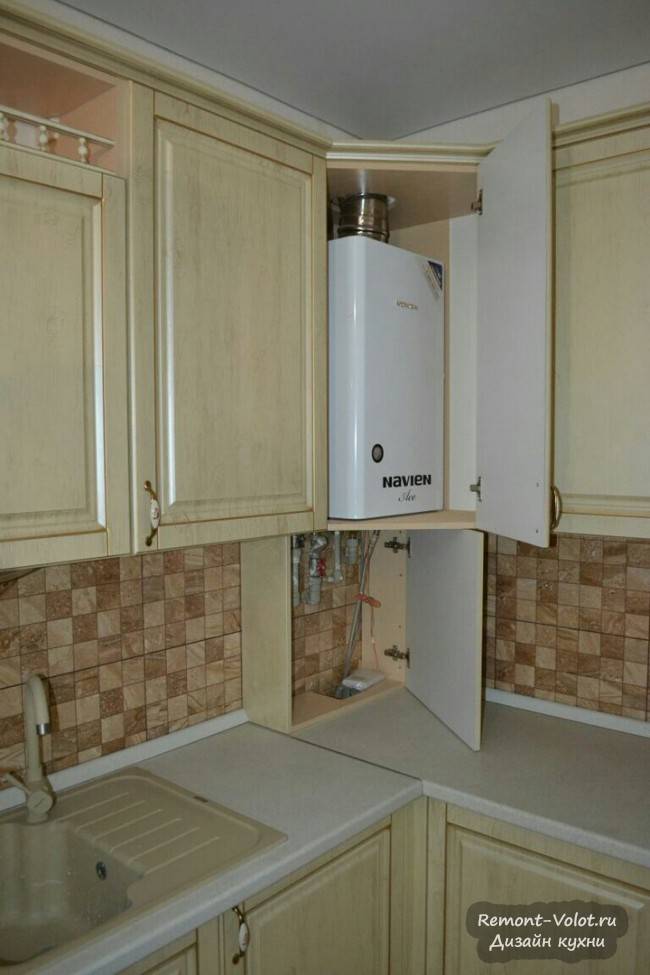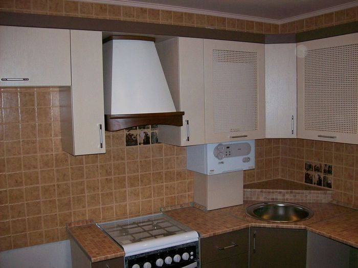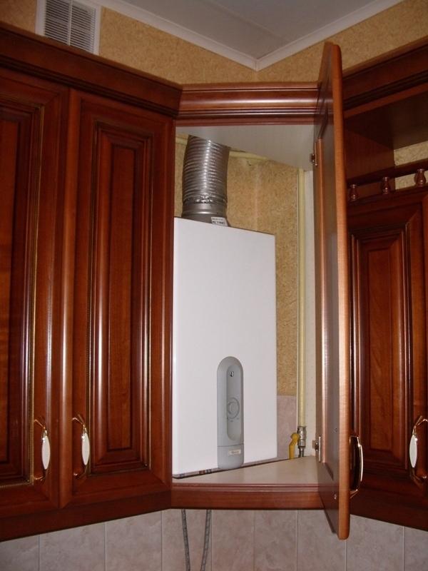 Nuances de conception de la conception d'une chaudière à gaz dans la cuisineUne autre solution consiste à placer l'équipement dans le coin de la cuisine derrière les armoires suspendues.