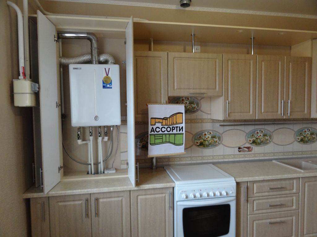 • L'installation d'une chaudière à gaz dans un ensemble de cuisine est également prévue par les règles. L'appareil chauffe pendant le fonctionnement, de sorte que la distance aux parois latérales ne peut pas être inférieure à 5 cm, à la porte de l'armoire de camouflage - au moins 10 cm.