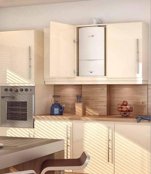 • Placement de l'équipement dans une armoire murale ou au sol spéciale. Les principales exigences pour cette option sont le respect des réglementations en matière de sécurité incendie, garantissant une quantité d'air suffisante dans l'armoire. Pour ce faire, assurez une ventilation suffisante et évitez les incendies en doublant l'intérieur de l'armoire avec du papier d'aluminium ou des matériaux similaires. Une telle boîte doit être en harmonie avec les éléments de conception de l'ensemble de cuisine, la compléter. Si la chaudière est installée au sol, la trousse à crayons au sol deviendra un moyen original de la déguiser, sans contredire la direction stylistique principale de la cuisine. En plus d'un aspect attrayant, l'étui à crayons empêchera les enfants d'entrer dans des équipements dangereux.