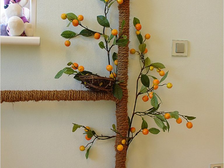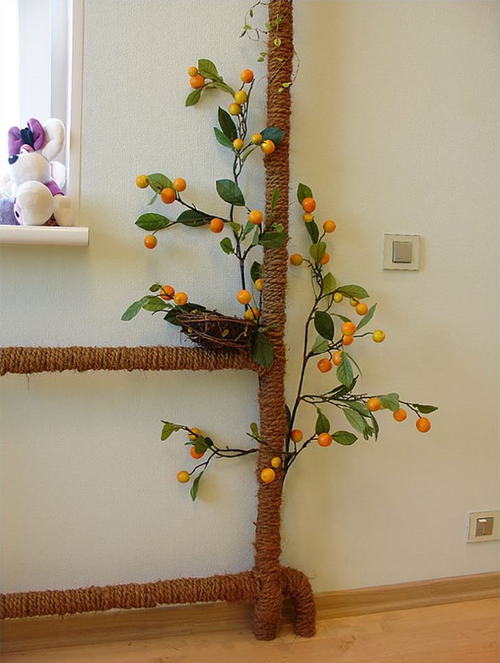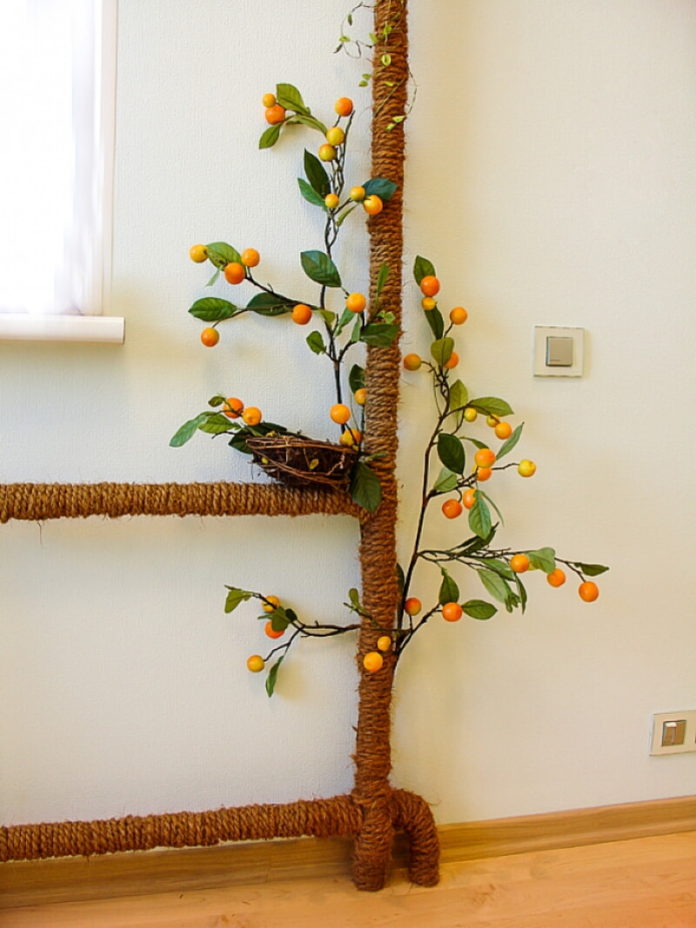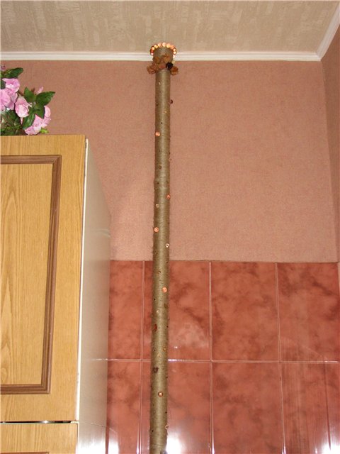 Un système de chauffage fraîchement peint doit être tressé autour d'une corde rigide (corde de couleur), simulant ainsi un tronc d'arbre (palmier). Des feuilles artificielles, de vraies branches d'arbres, des anneaux en bois aideront à compléter le tableau. De plus, vous pouvez apporter des éléments de décor originaux qui sont déjà présents dans d'autres pièces, soulignant ainsi la communauté de style.