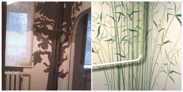 Si vous vous écartez de la couleur blanche généralement acceptée, qui est traditionnellement peinte des tuyaux du système de chauffage, vous pouvez "transformer" un tuyau vertical dans le coin de la pièce en arbre.Et déjà à partir de ce tronc, passez à la peinture des murs adjacents, en dessinant des branches dessus. Un tel travail est à la portée même d'un artiste non professionnel.