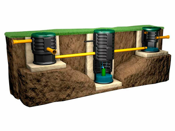 - Il est destiné aux terrains accidentés et son essence réside dans le fait que le tuyau d'entrée est placé beaucoup plus haut que la sortie ;