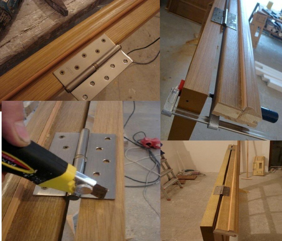 Vous pouvez maintenant scier les extrémités du linteau de vos propres mains (encore une fois, avec une scie à onglet ou une boîte à onglet). Cette procédure se fait à un angle de 45°. Viennent ensuite les charnières de porte. Leur installation doit être faite avec le plus grand soin.
