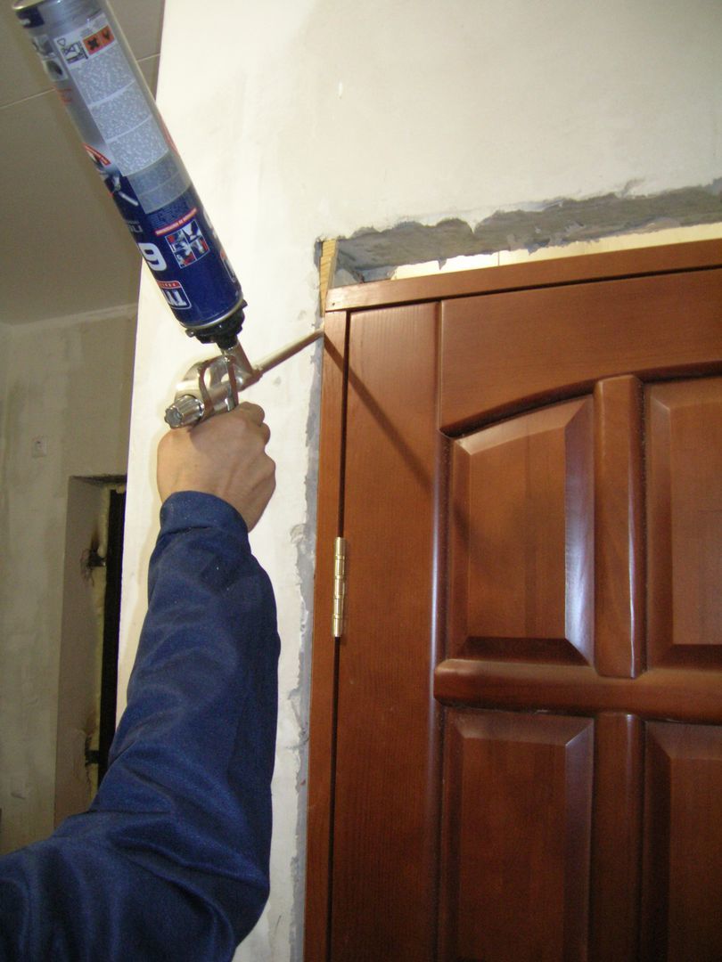 La porte est finie avec des éléments supplémentaires. Les vides sont remplis de mousse, qui les fixe également sur l'ouverture. Plus loin le long du périmètre, l'ouverture est garnie de chambranles.