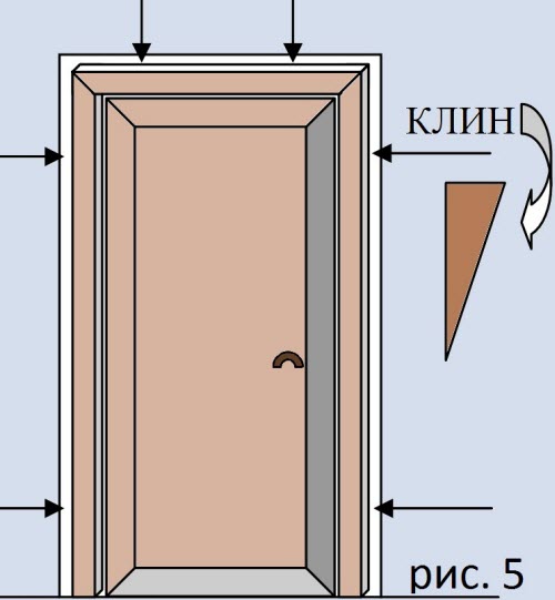 - Installez le bloc de porte dans l'ouverture préparée et fixez-le avec des cales en bois.