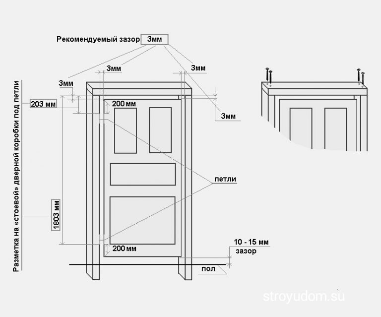 Réglez la barre transversale (crémone) avant d'insérer les boucles. Sur chaque vantail, coupez les charnières dans la porte elle-même et dans le montant latéral. Retirez le fragment créé précédemment.