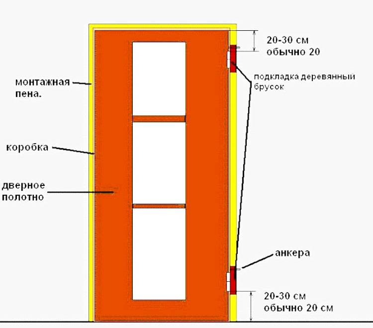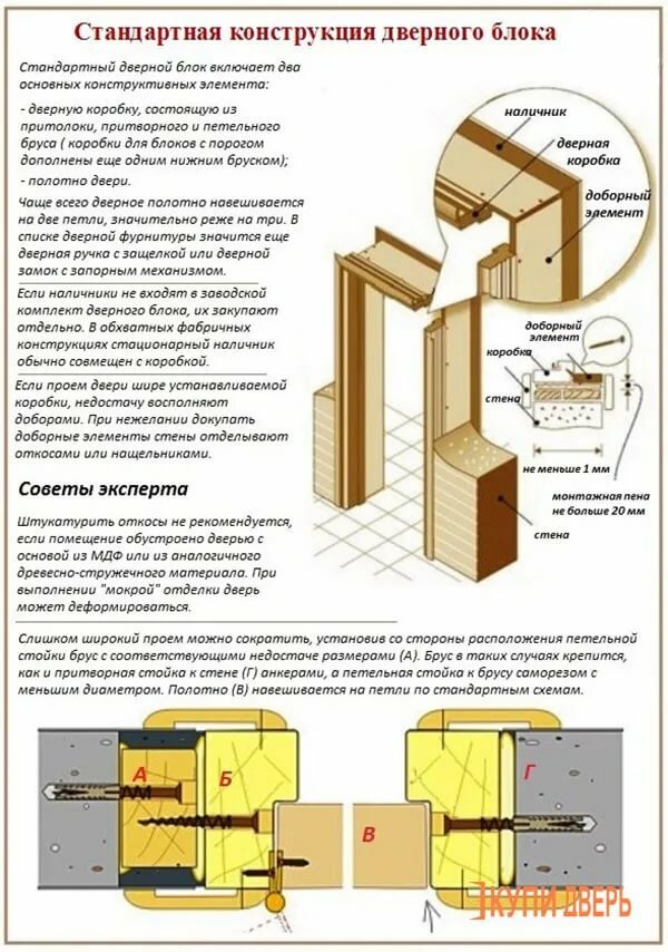 - Nous fixons le bloc de porte à l'aide de mousse de montage. Lors du choix, assurez-vous de vous familiariser avec ses caractéristiques. Vous devez connaître le coefficient de dilatation secondaire de la mousse : plus il est petit, mieux c'est. Enlever l'excédent de mousse après durcissement.