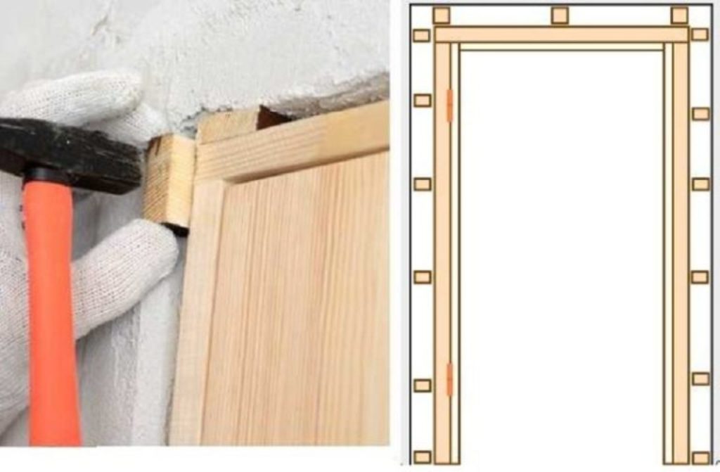 Après cela, vous devez fixer le bloc de porte aux cloisons. Pour ce faire, il est nécessaire de percer des trous d'un diamètre de 6 mm dans la partie saillante des linteaux en bois. Ensuite, des chevilles sont martelées dans ces trous. Lors du processus de fixation du bloc de porte, il est nécessaire de temps en temps de vérifier la position de la structure par rapport aux parois latérales.
