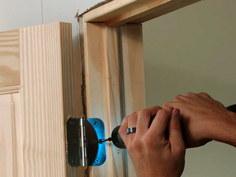 Lorsque la boîte est de niveau et fixée, il est temps de passer à l'installation du vantail de la porte. Tout d'abord, les charnières sont vissées sur la porte. Le plus souvent, des charnières amovibles sont proposées pour les portes intérieures, qui ont une tige qui peut être retirée ou fixée dans une charnière. Des charnières monoblocs sont également vendues, mais elles ne sont pratiquement plus utilisées actuellement.