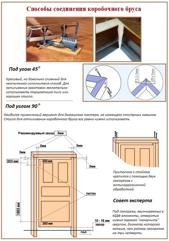 - Assemblez la boîte et installez les charnières. Il existe de légères différences entre les types de portes. Pour les structures pivotantes, vous devez fabriquer 2 fragments d'une poutre de cadre sciée à 45 ° à partir de chutes de planche (ce sera la plaque supérieure nécessaire pour mesurer l'emplacement des boucles) et la connecter aux supports latéraux.