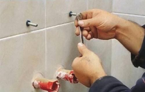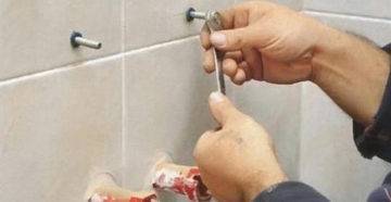 Le lavabo est mis de côté, ils prennent une perceuse et font des trous pour les montants. Pour percer des carreaux de céramique, vous aurez besoin d'une perceuse en forme de lance avec une soudure pobedit, et pour approfondir davantage dans le mur, elle est remplacée par une perceuse à béton conventionnelle. La profondeur du trou doit être supérieure de 5 à 10 mm à la longueur de la cheville, mais le diamètre, au contraire, est inférieur de quelques millimètres.