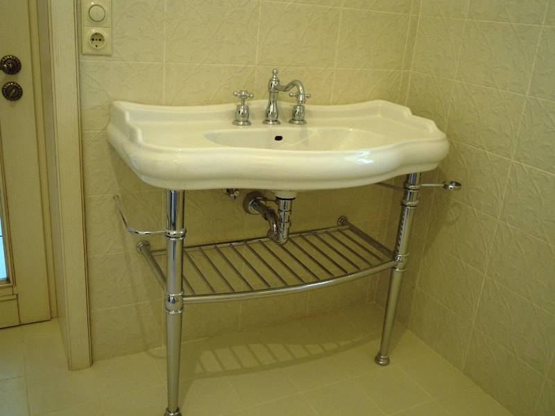 • la version classique, composée d'un socle et d'une vasque. Les deux éléments sont montés en alternance, le bol est fixé au mur et le socle est installé sans fixations supplémentaires. De tels modèles sont considérés comme les plus pratiques: individuellement, les parties du lavabo sont plus faciles à fixer qu'une structure solide, et en cas de siphon bouché, il suffit d'écarter la jambe;