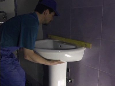 Un évier avec des raccords vissés est installé sur la jambe. Lors de l'essayage, il est conseillé de vérifier l'installation horizontale de la paroi arrière de l'évier à l'aide d'un niveau hydraulique.