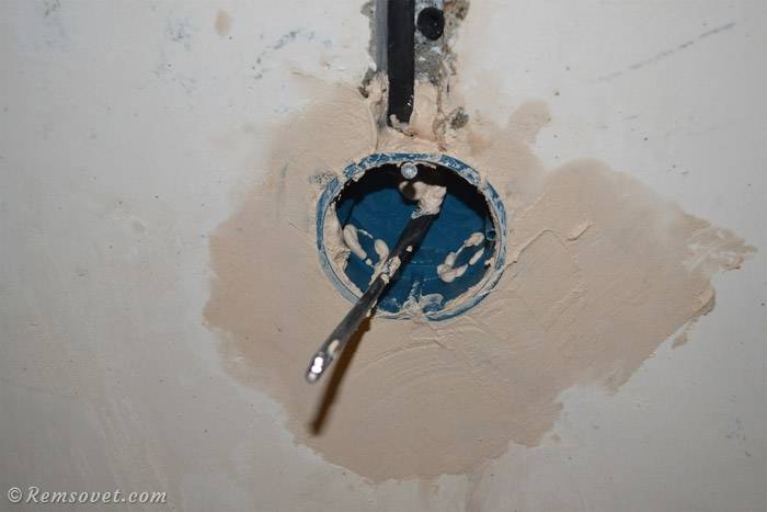 Ayant un trou prêt, vous pouvez couper un stroboscope dans le mur jusqu'au plafond, où se trouve la boîte de jonction, afin de faire une dérivation du câble d'alimentation. Pour compenser l'erreur, le câble posé est allongé de 30 à 40 cm, à l'avenir, l'excédent pourra être coupé. En ce qui concerne la pose du câble et la connexion à la boîte de jonction, vous devrez mettre la pièce hors tension.