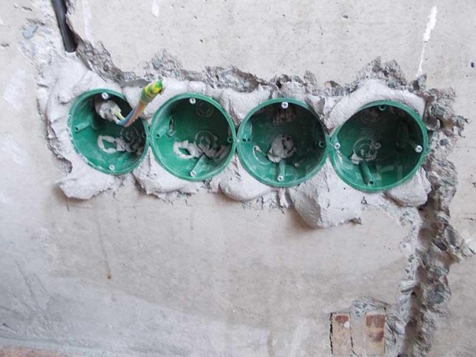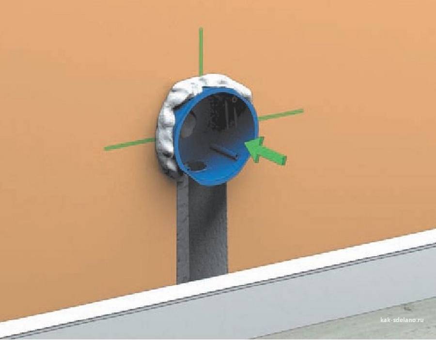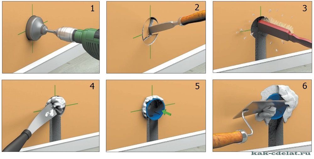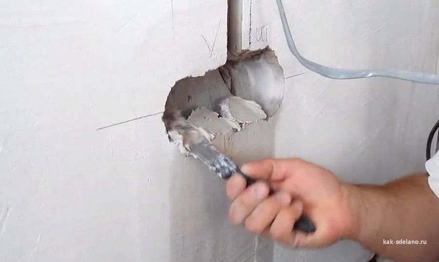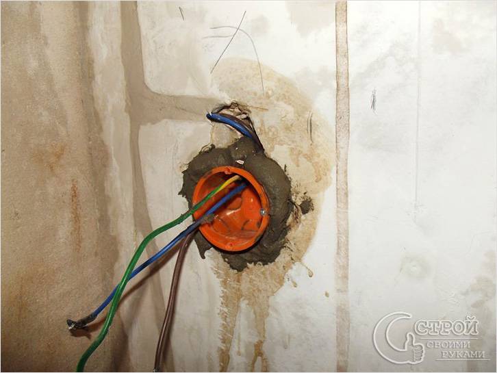 Deux minutes avant de poser la boîte dans le mur, le trou est mouillé d'eau. Une fois le liquide absorbé, une couche de gypse est appliquée sur ses parois à l'aide d'une spatule. Un fil est enfilé dans le verre, sa partie arrière est également enduite d'une solution et la douille est insérée dans le trou.
