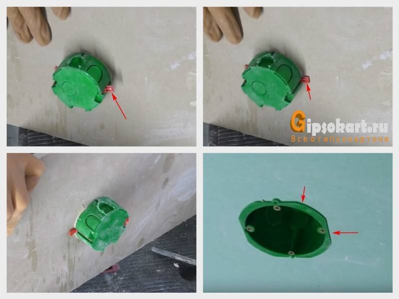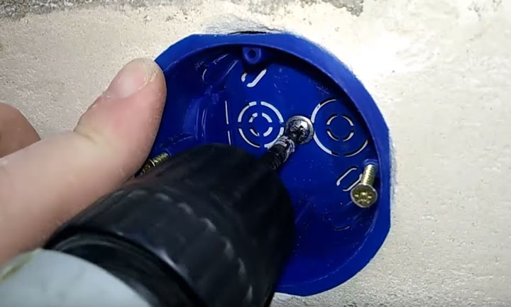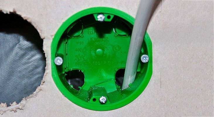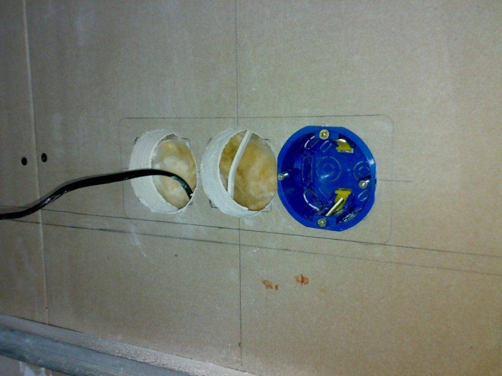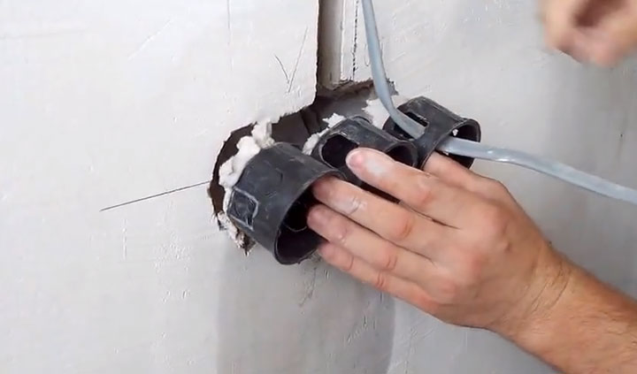 Dans les trous pratiqués, une douille en plastique est montée sous l'élément principal de la prise. Sans cela, il est très difficile de le fixer dans le vide sous la cloison sèche.