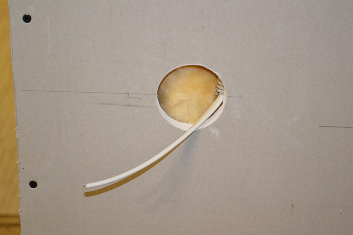 Tout d'abord, vous devez percer un trou dans la prise dans laquelle le câblage est inséré. Il est souhaitable que la longueur du câble soit avec une marge. Insérez ensuite la douille en plastique dans l'ouverture pratiquée.