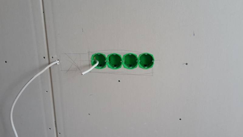 Avant de faire un trou dans la cloison sèche, des marques sont faites où des gobelets en plastique pour la sortie seront installés. Les marques doivent correspondre au brochage.