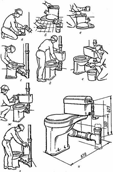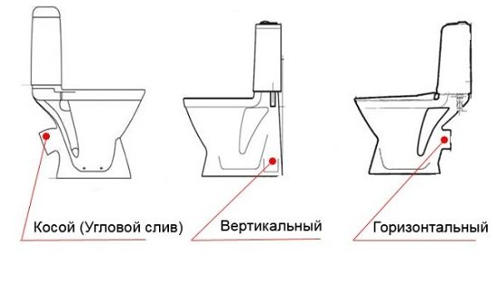 La méthode d'installation est choisie en fonction de la forme de la sortie de la cuvette des toilettes : dans le cas d'une sortie oblique, elles sont installées au sol ; avec une sortie verticale, la cuvette des toilettes est montée dans le mur à un angle de 90⁰ ; tandis qu'horizontalement, il est également dans le mur, mais à un angle de 30 à 40⁰.
