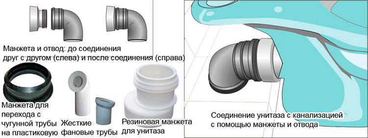 S'il est nécessaire de déplacer le centre de la sortie par rapport à la prise du système d'égout, une ondulation ou un coin avec un tuyau court doit être utilisé pour connecter les éléments. La plomberie est reliée à l'égout à l'aide d'un manchon en caoutchouc, ce qui vous permet de terminer les travaux assez rapidement.