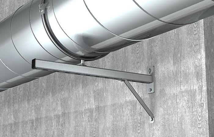 Les pinces, supports, cintres sont fixés avec un pas de plus de 4 mètres pour l'installation de conduits d'air horizontaux. Une telle marche est pertinente si le diamètre d'un tuyau rond ou le plus grand côté d'une section rectangulaire ne dépasse pas 40 cm.La distance de marche est réduite à 3 mètres si les dimensions spécifiées du canal dépassent 40 cm.