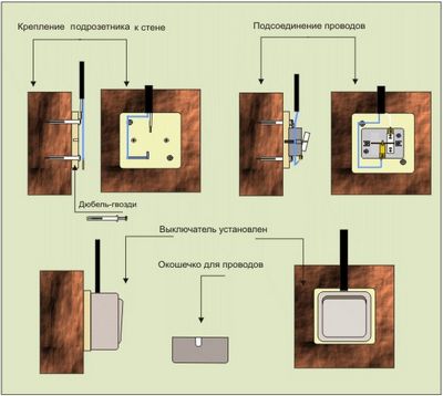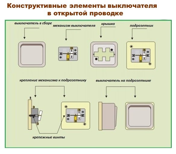 S'il n'y a pas de boîtier de prise et que l'interrupteur est monté à l'extérieur, la base est vissée à la surface du mur avec deux vis. C'est un peu plus compliqué que le cas précédent, mais vous pouvez comprendre le principe de fonctionnement.