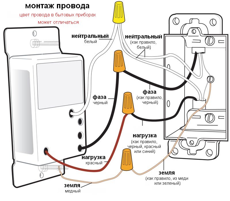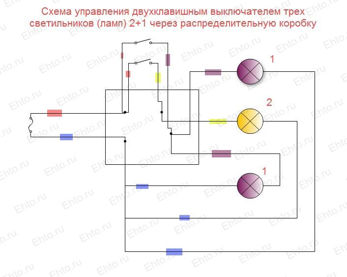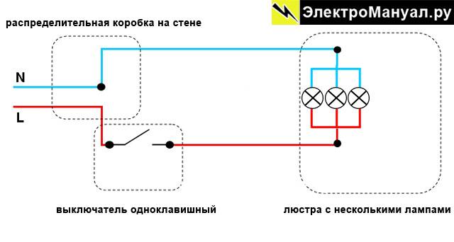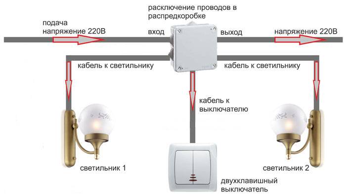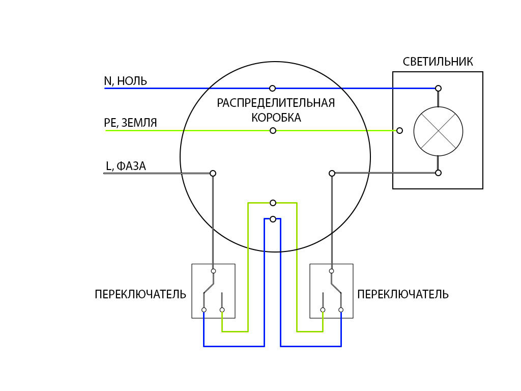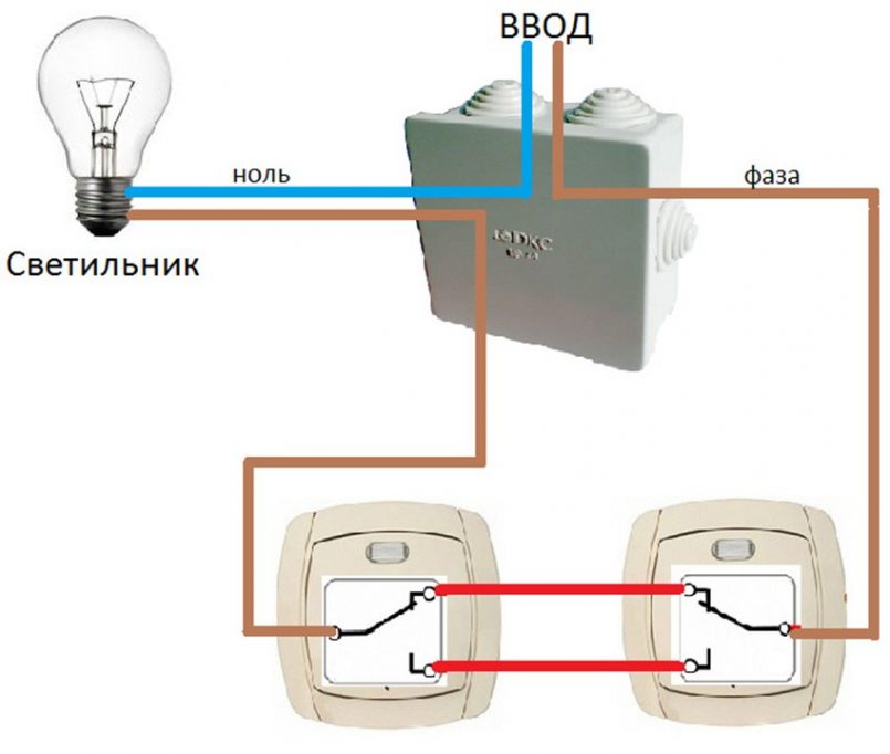 Le schéma de branchement n'est pas beaucoup plus compliqué que le schéma de branchement d'un interrupteur classique. Pour mettre en œuvre un tel schéma, des câbles à deux conducteurs sont utilisés, dans la vie de tous les jours, avec une section de 1,5 mm2 sur cuivre.