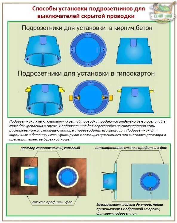Selon la méthode d'installation, il existe des commutateurs internes et externes. La première option est installée dans l'appartement, car de telles structures ont l'air esthétiques. Pour la sécurité lors de l'installation, un boîtier spécial est installé, appelé boîtier de prise.