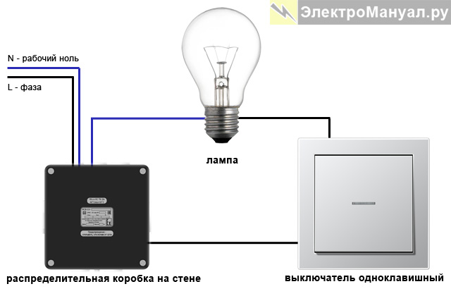 Nous savons tous que deux fils, phase et zéro, viennent à l'ampoule. Le commutateur est installé dans le circuit de phase. Le principe de son fonctionnement est de fermer et d'ouvrir le mécanisme de commutation du fil de phase allant à l'ampoule. Le fil neutre arrive à l'ampoule directement de la boîte de jonction, sans coupure (pour plus de détails, voir le schéma de l'interrupteur simple).