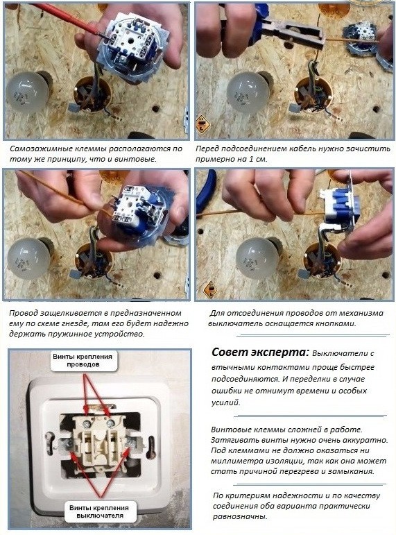 Après avoir préparé le site d'installation, vous pouvez commencer à vous connecter.La clé de l'interrupteur 1 a deux pinces de contact, où les fils dénudés sont fixés avec des boulons. Chacun des noyaux doit être dénudé de 5 à 8 mm