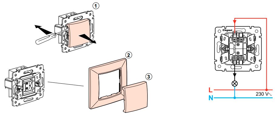 Pour ce faire, les vis de serrage sont desserrées, les fils sont insérés dans les douilles et les vis sont à nouveau serrées. Câblage entre deux interrupteurs.