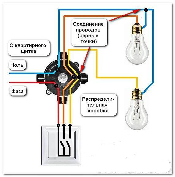 - Dans la boîte de jonction, le fil de phase est connecté aux deux contacts du premier interrupteur. Deux appareils sont interconnectés par quatre cavaliers. Les contacts des lampes sont connectés au deuxième interrupteur. Le deuxième fil des appareils d'éclairage est commuté avec le zéro provenant du tableau de distribution. Lors de la commutation des contacts, les circuits communs des interrupteurs se ferment et s'ouvrent par paires, garantissant que la lampe correspondante est allumée et éteinte.