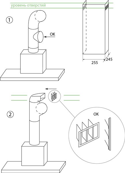 Le premier type est conçu pour transporter les produits de combustion vers le conduit de ventilation du bâtiment par un conduit d'air. Par conséquent, en plus de fixer le corps de la hotte au-dessus de la cuisinière à gaz, il sera nécessaire d'installer des canaux pour que l'air sorte par l'évent.