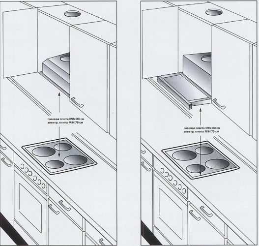 La hotte encastrable est installée dans une armoire murale spécialement désignée à cet effet. Il doit d'abord être préparé en enlevant la partie inférieure pour installer le panneau de travail (réception) et en faisant un trou dans la partie supérieure de l'armoire pour le conduit d'air. Les hottes encastrables n'ont pas besoin de boîtier décoratif, et certains modèles n'en ont pas du tout, représentant un assemblage d'unités fonctionnelles reliées entre elles.
