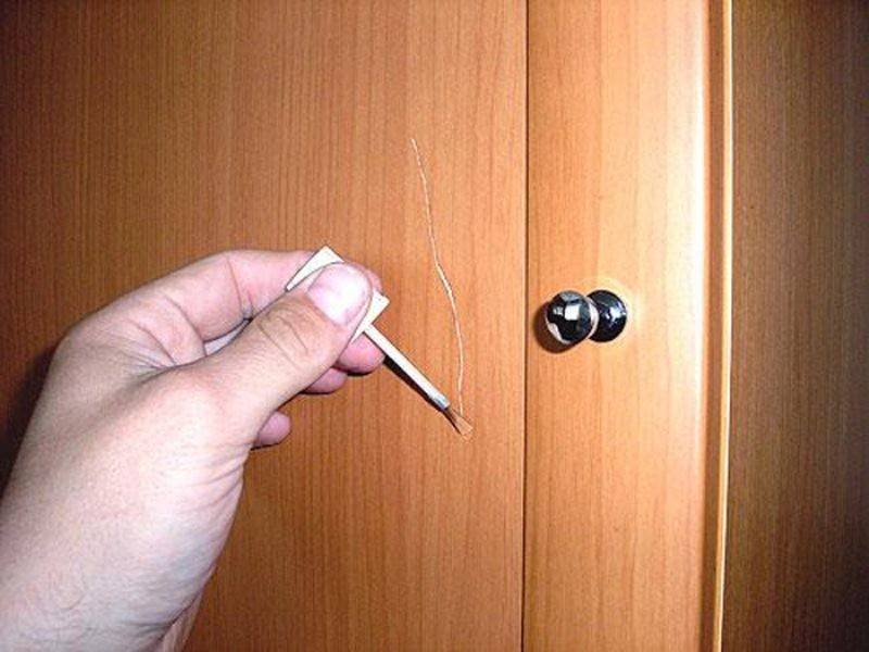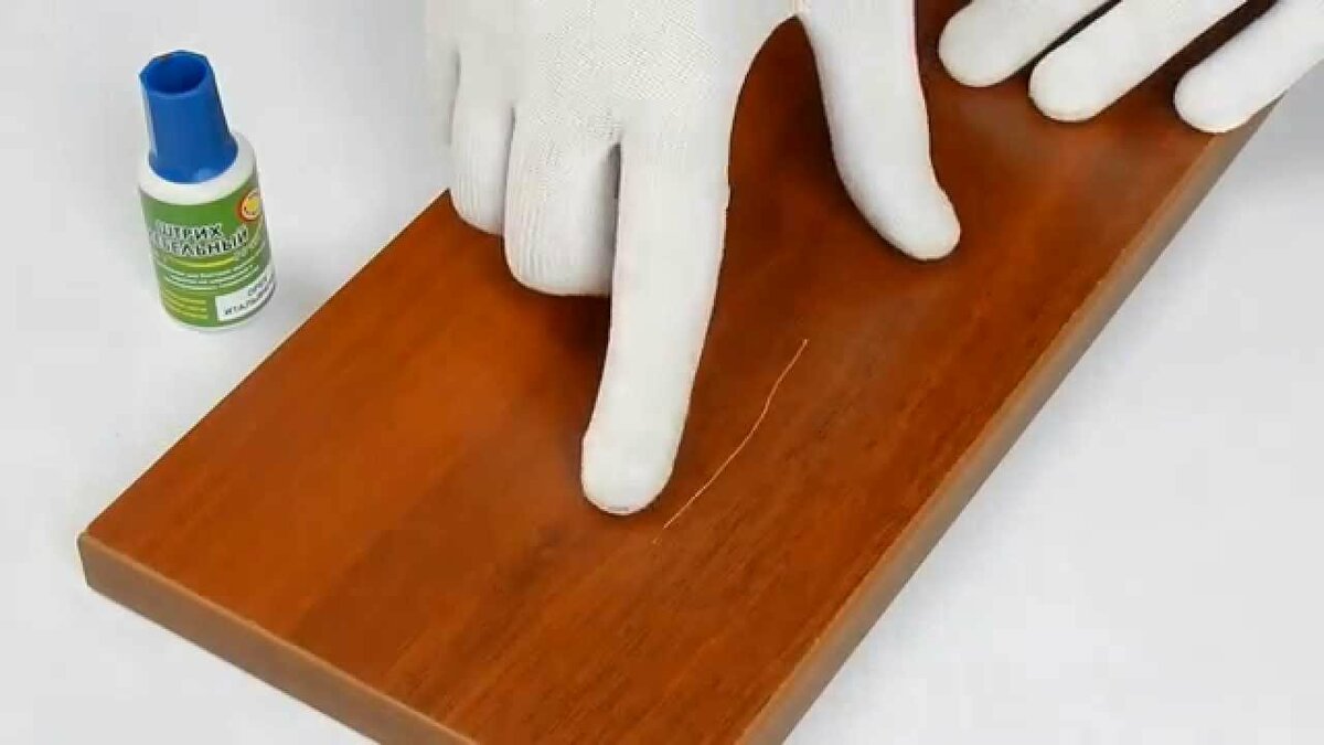 En plus du vernis crémeux, vous pouvez utiliser un bâton de cire dure conçu pour l'entretien des portes et du stratifié. Pour que le produit remplisse toute la surface de la rayure, il est fondu au bain-marie.