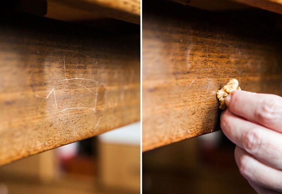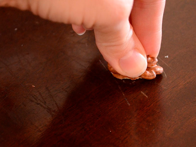 Le remède le plus abordable est la noix habituelle. Vous devez le prendre et le nettoyer, le casser en 2 parties et frotter les rayures avec le noyau. Après séchage, la zone ébréchée s'assombrit et se rapproche du ton du vernis avec lequel le bois a été traité à l'origine. Frotter ensuite la surface avec un chiffon et recouvrir d'un vernis incolore.