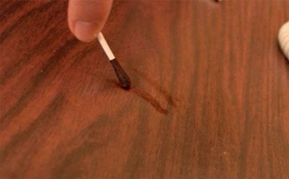 Sur les surfaces en bois foncé, l'iode aidera à masquer les dommages. Pour ce faire, la pharmacie doit être diluée avec de l'eau dans un bol séparé et appliquée avec un coton-tige sur l'espace.