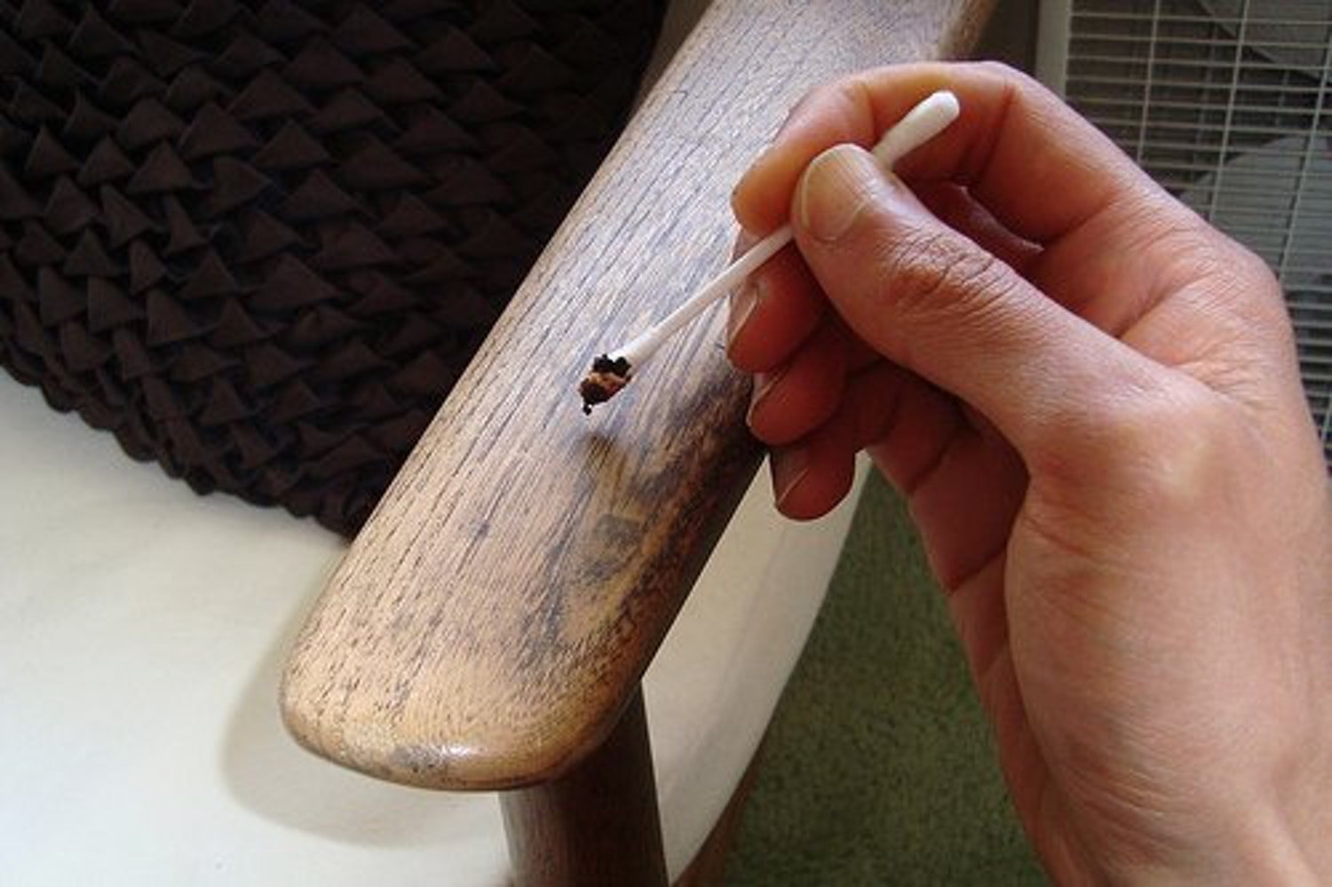 Les fumeurs de cigarettes peuvent tirer au moins certains avantages de leur mauvaise habitude. Pour réparer une égratignure sur un meuble, vous devez prendre de la cendre de cigarette et la mélanger en proportions égales avec de la cendre. En ajoutant une petite quantité d'eau, le mélange est amené à l'état de bouillie et la zone endommagée est scellée avec. Pour les meubles de couleur claire, seule la cendre de cigarette fera l'affaire, sans ajout de cendre.