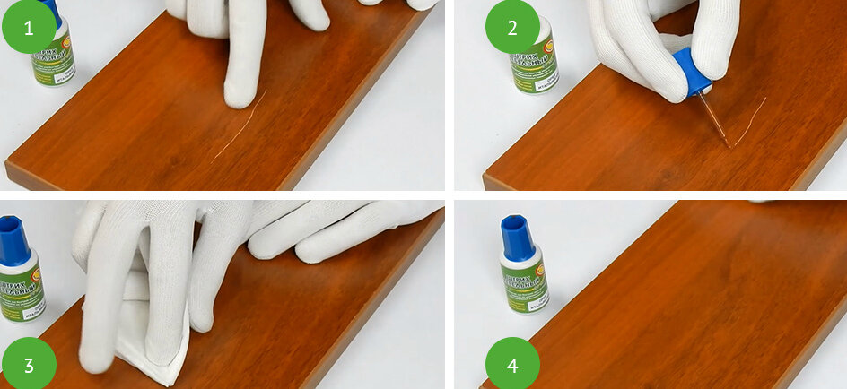 Une autre composition avec laquelle la restauration des rayures est effectuée rapidement et de manière fiable. Le mastic redonne de la brillance aux supports abîmés, colmate les défauts mécaniques : éclats, craquelures, traces de griffes d'animaux. L'outil peut être acheté prêt à l'emploi ou faites-le vous-même: