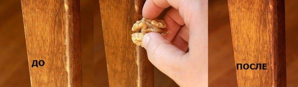 Les fruits de noix ont de bonnes qualités pour teinter les matériaux en bois. Pour enlever les rayures, il est conseillé de choisir le noyau d'une noix mûre crue. Il est nécessaire d'essuyer la zone à problème avec, et après un certain temps, la zone endommagée du produit en bois acquiert la couleur du vernis.