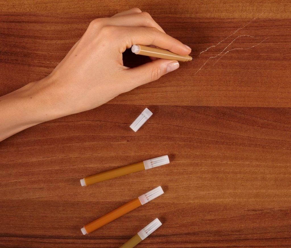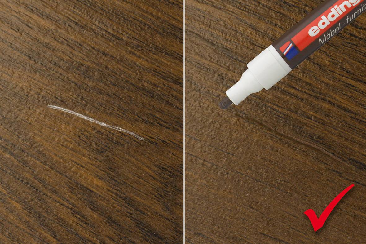 Un coup pour la restauration de puces est considéré comme un outil professionnel et ressemble à un correcteur d'épreuves de bureau.Il est utilisé pour couvrir les coutures peu profondes, enlever les déchirures, les rayures, les éraflures. Une composition de ce type s'applique facilement sur les meubles ou les sols, prend rapidement et résiste à l'humidité et aux températures extrêmes. Le trait ne laisse pas de traces et reste longtemps résistant à l'abrasion. Il est appliqué sur le défaut après avoir nettoyé la surface et, en séchant, le meuble est verni.