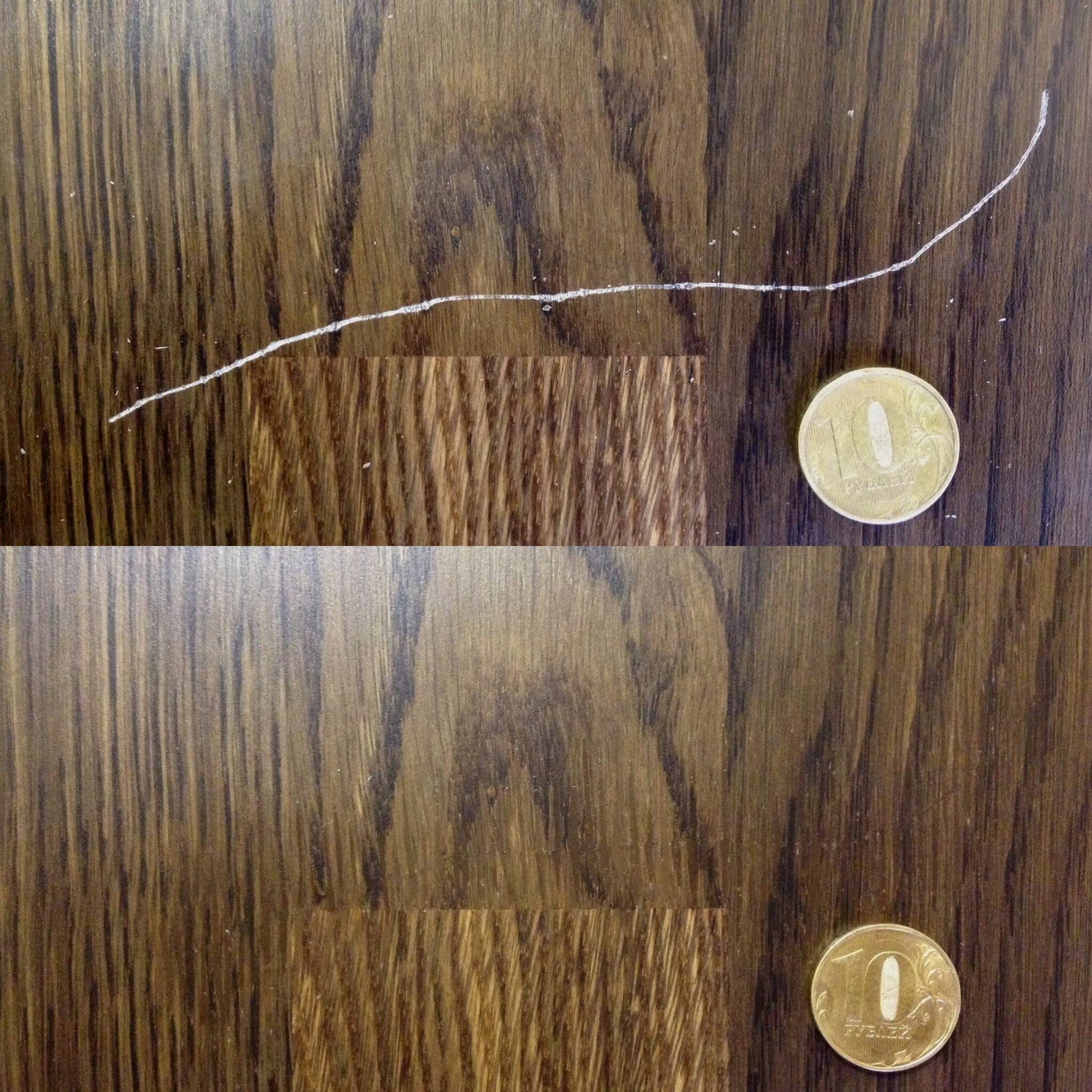 Le crayon de cire est plus résistant à l'humidité et vous permet de vous débarrasser des dommages profonds. Bien sûr, en y regardant de plus près, la rayure sera visible, mais de loin, elle n'est pas visible et presque imperceptible.