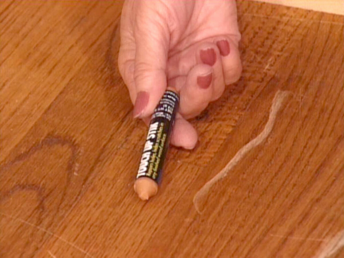 Les crayons de cire aident à masquer les rayures sur les meubles d'un seul coup. Ils sont vendus dans toutes les quincailleries, ont une variété de nuances dans la couleur de l'arbre, il ne sera donc pas difficile de choisir le bon outil. La surface endommagée doit être essuyée de la poussière, séchée, puis frottée doucement avec un crayon.
