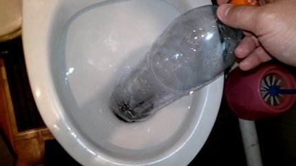 Un objet d'un diamètre approprié fait bien face à la tâche en tant que piston impromptu. Il suffit de couper le fond et d'utiliser le flacon de la même manière qu'un piston, seules les parois du flacon doivent pénétrer dans le canal. Le nettoyage des toilettes se fait selon un principe similaire en raison de la forte pression hydraulique du mouvement de haut en bas. Il est recommandé de remplir préalablement le nettoyeur de canalisations d'égout pendant 30 minutes. C'est un moyen efficace de nettoyer les toilettes sans piston ni câble.