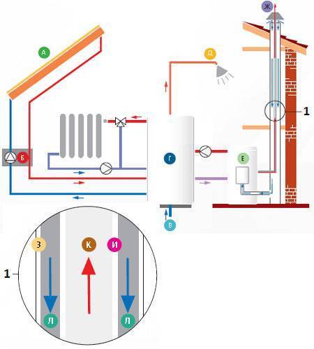 L'ensemble du schéma fonctionne sur les propriétés physiques du maintien d'une température positive constante dans les sources d'énergie à faible potentiel - c'est-à-dire l'air, l'eau, la terre. Le premier circuit de fluide frigorigène se réchauffe à la température de la source ambiante, puis transfère de l'énergie au fluide frigorigène, le compresseur aspire et comprime le fluide frigorigène, chauffant la substance à +125 C, puis la transporte vers le condenseur, qui envoie de la chaleur au circuit de chauffage.Après refroidissement, le réfrigérant devient liquide et le cycle de chauffage reprend.