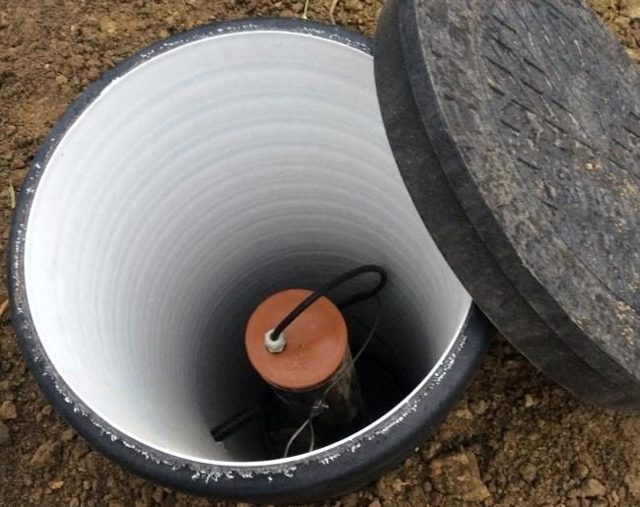 - En principe, un équipement de distribution automatique d'eau ou une pompe de surface peuvent également être placés dans un tel baril. De plus, un tube de drainage peut être installé au fond du caisson pour drainer le condensat accumulé en profondeur dans le sol.