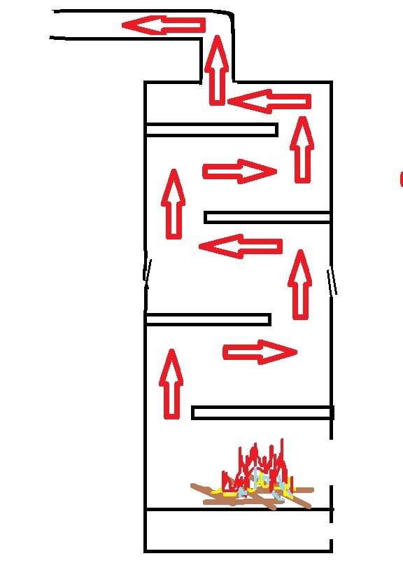 S'il est impossible d'allonger le tuyau, sa conception est modifiée. Des cylindres constitués d'un tuyau d'un diamètre de 300 à 400 mm sont soudés sur le tuyau de dérivation sortant du corps du four. Entre eux, ils sont reliés par des segments de tuyau d'un diamètre au moins égal à celui de la cheminée. Leur soudure est réalisée hors alignement pour augmenter le trajet des fumées.